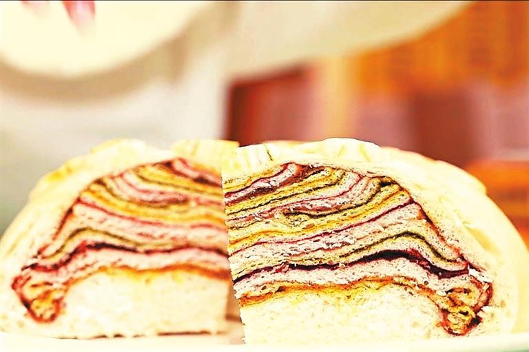 千層餅由于厚也大,要上籠蒸一個小時后才熟,揭了鍋蓋,熱氣騰騰的千層餅香味撲鼻,放涼了切塊,一層一層層次分明??诟兴绍?,香而不膩,回味無窮。