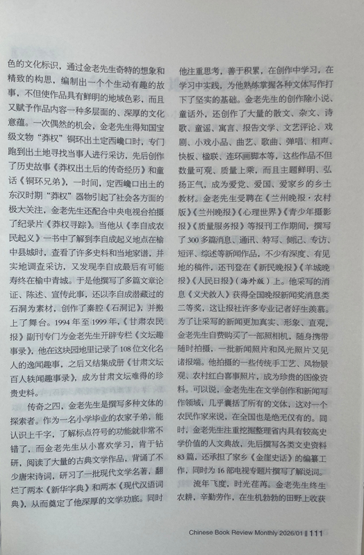傳奇之四,金老先生是撰寫多種文體的探索者。作為一名小學(xué)畢業(yè)的農(nóng)家子弟,能認(rèn)識上千字,了解標(biāo)點(diǎn)符號的功能就非常不錯了,而金老先生從小喜歡學(xué)習(xí),肯于鉆研,閱讀了大量的古典文學(xué)作品,背誦了不少唐宋詩詞,研習(xí)了一批現(xiàn)代文學(xué)名著,翻爛了兩本《新華字典》和兩本《現(xiàn)代漢語詞典》,從而奠定了他深厚的文學(xué)功底。同時他注重思考,善于積累,在創(chuàng)作中學(xué)習(xí),在學(xué)習(xí)中實踐,為他熟練掌握各種文體寫作打下了堅實的基礎(chǔ)。金老先生的創(chuàng)作除小說、童話外,還創(chuàng)作了大量的散文、雜文、詩歌、童謠、寓言、報告文學(xué)、文藝評論、戲劇、小戲小品、曲藝、歌曲、彈唱、相聲、快板、楹聯(lián)、連環(huán)畫腳本等,這些作品不但數(shù)量可觀、質(zhì)量上乘,而且主題鮮明、弘揚(yáng)正氣,成為愛黨、愛國、愛家鄉(xiāng)的鄉(xiāng)土教材。金老先生受聘在《蘭州晚報·農(nóng)村版》《蘭州晚報》《心理世界》《青少年攝影報》《質(zhì)量服務(wù)報》等報刊工作期間,撰寫了300多篇消息、通訊、特寫、側(cè)記、專訪、短評、綜述等新聞作品,不少有深度、有見地的稿件,還刊登在《新民晚報》《羊城晚報》《人民日報》(海外版)上。他采寫的消息《義犬救人》獲得全國晚報新聞獎消息類二等獎,這讓報社許多專業(yè)記者好生羨慕。為了讓采寫的新聞更加真實、形象、直觀,金老先生自費(fèi)購買了一部照相機(jī),隨身攜帶隨時拍攝,一批新聞?wù)掌惋L(fēng)光照片又見諸報端。他拍攝的一些傳統(tǒng)手工藝、風(fēng)物景觀、農(nóng)村紅白喜事照片,成為珍貴的圖像資料。可以說,金老先生在文學(xué)創(chuàng)作和新聞寫作領(lǐng)域,幾乎囊括了所有的文體,這對一個農(nóng)民作家來說,在全國也是絕無僅有的。同時,金老先生注重挖掘整理省內(nèi)具有較高史學(xué)價值的人文典故,先后撰寫各類文史資料83篇,還承擔(dān)了家鄉(xiāng)《金崖史話》的編纂工作,同時為16部電視專題片撰寫了解說詞。