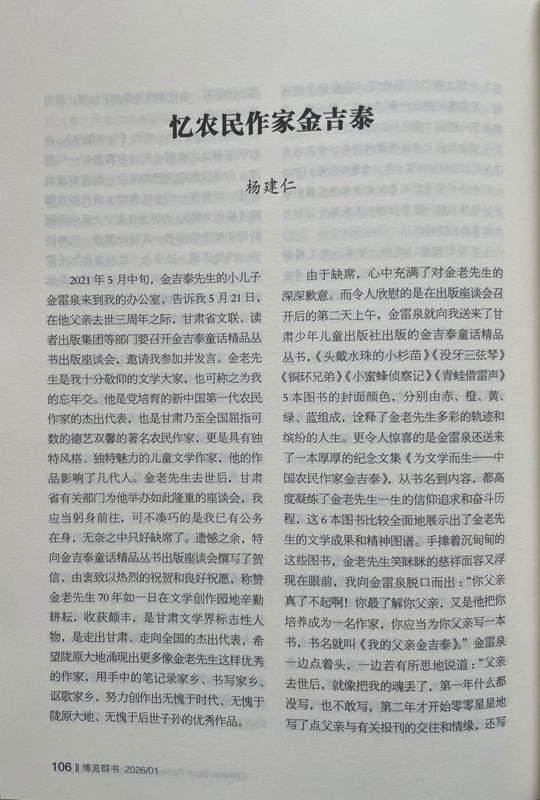 由于缺席,心中充滿了對金老先生的深深歉意。而令人欣慰的是在出版座談會召開后的第二天上午,金雷泉就向我送來了甘肅少年兒童出版社出版的金吉泰童話精品叢書,《頭戴水珠的小杉苗》《沒牙三弦琴》《銅環(huán)兄弟》《小蜜蜂偵察記》《青蛙借雷聲》5本圖書的封面顏色,分別由赤、橙、黃、綠、藍(lán)組成,詮釋了金老先生多彩的軌跡和繽紛的人生。更令人驚喜的是金雷泉還送來了一本厚厚的紀(jì)念文集《為文學(xué)而生——中國農(nóng)民作家金吉泰》,從書名到內(nèi)容,都高度凝練了金老先生一生的信仰追求和奮斗歷程,這6本圖書比較全面地展示出了金老先生的文學(xué)成果和精神圖譜。手捧著沉甸甸的這些圖書,金老先生笑瞇瞇的慈祥面容又浮現(xiàn)在眼前,我向金雷泉脫口而出:“你父親真了不起?。∧阕盍私饽愀赣H,又是他把你培養(yǎng)成為一名作家,你應(yīng)當(dāng)為你父親寫一本書,書名就叫《我的父親金吉泰》。”金雷泉一邊點(diǎn)著頭,一邊若有所思地說道:“父親去世后,就像把我的魂丟了,第一年什么都沒寫,也不敢寫,第二年才開始零零星星地寫了點(diǎn)父親與有關(guān)報刊的交往和情緣,還寫了點(diǎn)父親在生活和寫作中的軼事趣聞。您的建議非常好,我擔(dān)心駕馭不好,試試看吧。”我感覺金雷泉有點(diǎn)為難,馬上又安慰他:“不急,你用兩三年時間慢慢寫。”