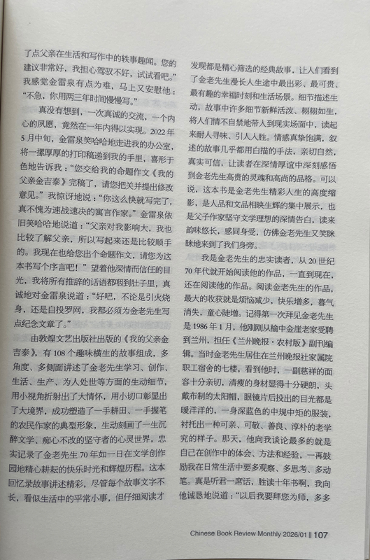 由敦煌文藝出版社出版的《我的父親金吉泰》,有108個趣味橫生的故事組成,多角度、多側(cè)面講述了金老先生學(xué)習(xí)、創(chuàng)作、生活、生產(chǎn)、為人處世等方面的生動細(xì)節(jié),用小視角折射出了大情懷,用小切口彰顯出了大境界,成功塑造了一手耕田、一手握筆的農(nóng)民作家的典型形象,生動刻畫了一生沉醉文學(xué)、癡心不改的堅守者的心靈世界,忠實記錄了金老先生70年如一日在文學(xué)創(chuàng)作園地精心耕耘的快樂時光和輝煌歷程。這本回憶錄故事講述精彩,盡管每個故事文字不長,看似生活中的平常小事,但仔細(xì)閱讀才發(fā)現(xiàn)都是精心篩選的經(jīng)典故事,讓人們看到了金老先生漫長人生途中最出彩、最可貴、最有趣的幸福時刻和生活場景。細(xì)節(jié)描述生動,故事中許多細(xì)節(jié)新鮮活潑、栩栩如生,將人們情不自禁地帶入到現(xiàn)實場面中,讀起來耐人尋味、引人入勝。情感真摯飽滿,敘述的故事幾乎都用白描的手法,親切自然,真實可信,讓讀者在深情厚誼中深刻感悟到金老先生高貴的靈魂和高尚的品格??梢哉f,這本書是金老先生精彩人生的高度縮影,是人品和文品相映生輝的集中展示,也是父子作家堅守文學(xué)理想的深情告白,讀來韻味悠長,感同身受,仿佛金老先生又笑瞇瞇地來到了我們身旁。