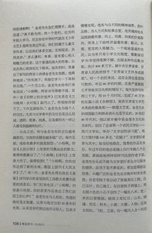 從此之后,我與金老先生的交往越來越密切,交流的話題也越來越廣泛,每次見面,他給我最多的就是鼓勵:“小楊啊,你在《人民日報》上發(fā)表的寫奧運(yùn)會的散文,看得我都激動了。”“小楊啊,《詩刊》上發(fā)表大作了,值得祝賀!”“小楊啊,你的創(chuàng)作達(dá)到了新的水準(zhǔn),都登上國刊《人民文學(xué)》了。”有一次,金老先生得知我在《星星》詩刊舉辦的首屆農(nóng)民工詩歌大獎賽中獲獎的消息后,專門打來電話:“小楊啊,向你表示祝賀,你的獲獎作品表達(dá)了我們農(nóng)民工的心聲!”金老先生與人相處,傳遞的絕對是正能量,從我與他交往的30多年時光里,從來沒有聽到過他非議別人。后來才慢慢發(fā)現(xiàn),他有與眾不同的精神境界、質(zhì)樸品格、為人方式和處事態(tài)度,他靈魂深處永遠(yuǎn)流淌著向善、向上、向真、向美的價值取向,渾身上下始終洋溢著執(zhí)著、豁達(dá)、樂觀、寬容的人格魅力。一個地地道道的農(nóng)民,從當(dāng)年只有小學(xué)文化程度,靠勤奮自學(xué)70年堅持筆耕不輟,出版各種作品集25部,共計400多萬字,被中共甘肅省委、甘肅省人民政府授予“甘肅省文藝終身成就獎”。對一個農(nóng)民來說,這在全國也是屈指可數(shù)的。年近80歲的時候,在患嚴(yán)重眼疾幾乎導(dǎo)致雙目失明的情況下,每天堅持寫作兩三千字,用10個月時間,完成了45萬字的長篇小說《農(nóng)耕圖》,榮獲甘肅省文學(xué)藝術(shù)類政府最高獎——敦煌文藝獎,金老先生的頑強(qiáng)毅力和拼命勁頭也是罕見的。20世紀(jì)80年代初,他以家鄉(xiāng)榆中縣金崖鄉(xiāng)文化站為依托,創(chuàng)辦了全省第一個農(nóng)民文學(xué)社——苑川文學(xué)社,舉辦“文學(xué)創(chuàng)作講習(xí)班”,吸引方圓村鎮(zhèn)100多名“泥腿子”文學(xué)愛好者參與其中,每當(dāng)經(jīng)他修改、推薦的作品發(fā)表后,年過半百的他總是騎上自行車跑幾十公里路,喜滋滋地將樣報樣刊送到作者手里,金老先生樂此不疲為文學(xué)愛好者全方位服務(wù)的情懷,在當(dāng)下是不多見的,更加顯得彌足珍貴。興趣廣泛的金老先生在晚年時突發(fā)奇想,在老宅院子里啟動了家庭美化工程,自己設(shè)計、自己施工,在自家院子西墻上,用五顏六色的小石子創(chuàng)作了一幅長八米、寬二米的巨型壁畫,畫面上有紅日、山水、碌碡、西瓜、樹木、小鹿、大雁、人物,還有太陽灶、飛機(jī)、衛(wèi)星,好一幅天人合一的田園風(fēng)光畫。站在壁畫面前,讓人遐想萬千、拍手叫絕,這一獨(dú)具特色的創(chuàng)舉,完全表達(dá)了金老先生所渴望的理想王國和精神家園。2014年4月,金老先生家庭被國家廣播電視總局授予首屆全國“書香之家”稱號。進(jìn)入耄耋之年的金老先生,創(chuàng)作激情依然旺盛,他又癡迷于劇本創(chuàng)作,先后創(chuàng)編了大型劇目4部,小戲小品曲藝46個。他不僅要創(chuàng)作劇本,而且還要想方設(shè)法搬上舞臺。為此他東奔西跑,甚至還要自掏腰包,千方百計尋找業(yè)余劇團(tuán),想盡辦法爭取高水平、低成本演出。雁過留聲,腳踏留痕,鄉(xiāng)村廣場、學(xué)校操場、打麥場上都留下了他帶隊演出的閃光足跡和百姓的歡歌笑語。興致高時,金老先生還上臺扮演一個角色,過足他愛戲唱戲的癮,完全和大家心連心、共歡樂。晚年的他最喜歡表演自編自導(dǎo)的古劇種“扁擔(dān)戲”,除了在村上幼兒園演出外,大多在自家的院子里演出,有時觀眾只有他老伴和孫女,還有一條忠實的小狗。金老先生用這種獨(dú)特的方式,表達(dá)對民族優(yōu)秀傳統(tǒng)文化的敬畏和弘揚(yáng),也讓我們感受到一位真正熱愛生活的作家,一定是牢牢生根在生他養(yǎng)他的這片土地上。2018年2月,他破例給子女們提出了一個心愿,在3月25日他85歲生日時,舉辦一場小型的家庭音樂會。于是金老先生請來了業(yè)余樂隊和歌唱演員,用合唱、歌伴舞等形式演出了由金老先生作詞的歌曲。金老先生身著紅色的盛裝,親自登臺演唱了由他改編的民歌《繡荷包》。他為家庭音樂會演出臺上撰寫的對聯(lián)是:音樂陶冶性情管弦悠揚(yáng)動四方,歌曲傳遞精神國歌隆重傳海外。兩個月后,金老先生安然去世,這場家庭音樂會竟成為他生命中的絕唱。金老先生就是這樣一位具有獨(dú)特人生信念、抱有獨(dú)特處世態(tài)度、富有獨(dú)特生活情趣、擁有獨(dú)特明亮童心的農(nóng)民作家,他身上始終散發(fā)著許多奇思妙想、創(chuàng)新火花和智慧光亮,讓人充滿無窮的敬意、敬畏和敬佩,我甚至認(rèn)為金老先生就是一位傳奇之人。