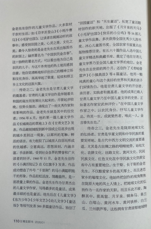 傳奇之二,金老先生是甘肅兒童文學(xué)的奠基者。甘肅的兒童文學(xué)創(chuàng)作是伴隨著共和國的誕生而發(fā)展壯大起來的,盡管起步較晚,但勢頭強(qiáng)勁,涌現(xiàn)出了一批優(yōu)秀作家和有影響的作品,金老先生就是其中的佼佼者。1956年6月,他的第一篇兒童文學(xué)作品《長城南邊的草地上》在《甘肅文藝》發(fā)表,作品敏銳捕捉到新中國成立后逐步出現(xiàn)的城鄉(xiāng)差別這一現(xiàn)象,以犀利的筆觸、鮮活的語言,有力批駁了以城里人自居而形成的優(yōu)越感,立意高遠(yuǎn),思想深刻,內(nèi)涵豐富,手法新穎,受到社會各界的贊譽(yù)和廣大讀者的好評。1960年11月,金老先生創(chuàng)作的《小滿歷險記》在《紅旗手》發(fā)表,作品成功塑造了外號“千里駒”的馬小滿聰明能干的形象,作品輕松活潑,情趣盎然,是一部質(zhì)量上乘的作品。金老先生作為甘肅杰出的兒童文學(xué)作家,寫得最多的是童話,成果最豐碩的也是童話。他先后在《兒童文學(xué)》《東方少年》《少年文藝》《幼兒文學(xué)》《童話報》等報刊發(fā)表300多篇童話作品,獨(dú)創(chuàng)了“田園童話”和“天生童話”,拓寬了童話題材創(chuàng)作的新天地,出版了《月牙泉的天馬》《小毛驢出國》《快樂的小公雞》等16部兒童文學(xué)作品集,多次獲得全國優(yōu)秀少兒圖書獎、冰心兒童圖書獎、全國農(nóng)家書屋重點(diǎn)出版物推薦目錄,有五六十篇作品入選中國兒童文學(xué)精選和典藏書庫,奠定了他在甘肅兒童文學(xué)界乃至全國兒童文學(xué)界的地位。金老先生在去世前的兩個月,還創(chuàng)作了《青蛙借雷聲》《小鎮(zhèn)典故》等6篇童話,他用一顆純真的童心與這個美好的世界和天真的孩子們深情告白。他是甘肅兒童文學(xué)的開創(chuàng)者、親歷者、實踐者和奠基者,他的成果已載入甘肅兒童文學(xué)乃至中國兒童文學(xué)的史冊,正如著名作家安武林評價:“在中國兒童文學(xué)作家之中,以農(nóng)民身份,抒寫兒童文學(xué)作品,終其一生,成就斐然者,唯此一人,金吉泰先生也。”