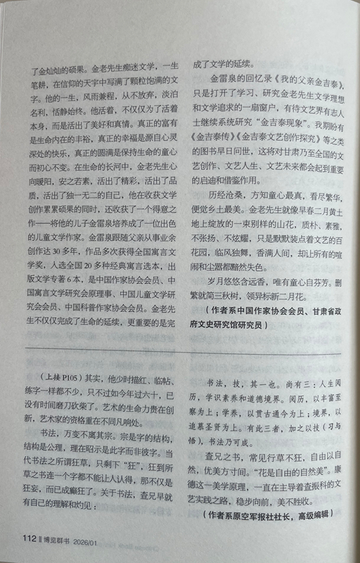 金雷泉的回憶錄《我的父親金吉泰》,只是打開了學(xué)習(xí)、研究金老先生文學(xué)理想和文學(xué)追求的一扇窗戶,有待文藝界有志人士繼續(xù)系統(tǒng)研究“金吉泰現(xiàn)象”。我期盼有《金吉泰傳》《金吉泰文藝創(chuàng)作探究》等之類的圖書早日問世,這將對甘肅乃至全國的文藝創(chuàng)作、文藝人生、文藝未來都會起到重要的啟迪和借鑒作用。