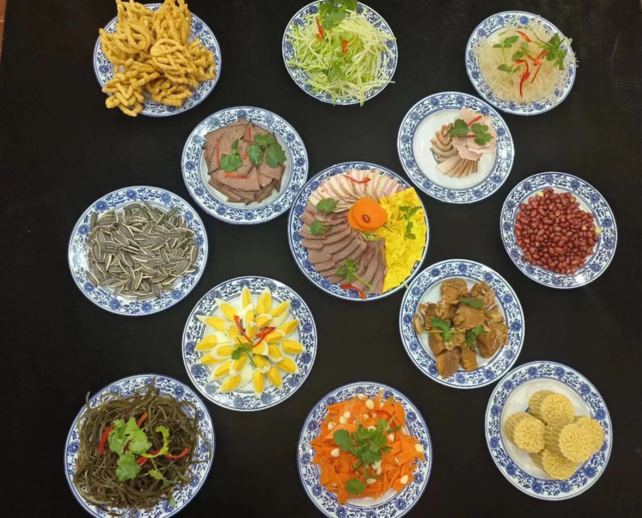 以常見(jiàn)的“十三花”為例,“十三花”,即十二個(gè)佐酒涼菜,加一旋菜全盤(pán)。整體具有太陽(yáng)花或旋轉(zhuǎn)八卦意象,遂美稱為“花”。