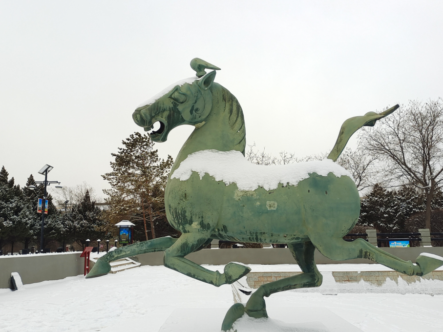 厚德載物的包容精神。特殊的地理環(huán)境,造就了涼州馬文化兼容并蓄、厚德載物的精神特質(zhì)。涼州大馬是中原馬、西域馬與蒙古馬雜交改良的產(chǎn)物,既保留了蒙古馬的耐力,又兼具西域馬的速度,這種“取長補短”的改良過程,本身就是包容精神的具體體現(xiàn)。“馬踏飛燕”作為東西方文化融合的藝術(shù)結(jié)晶,其形象既源于中原的“龍馬精神”,又吸納了西域“翼馬”的神話元素,成為兼容并蓄精神的具象化表達。它的鑄造工藝同樣展現(xiàn)出包容的特質(zhì),既采用了中原傳統(tǒng)的陶范鑄接法,又融入了西域藝術(shù)的浪漫主義風(fēng)格,寫實與想象完美結(jié)合,形成了形神兼?zhèn)洹忭嵣鷦拥乃囆g(shù)效果。