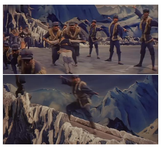 歌詞以“雪山紅星”為核心意象,將其喻為“純潔無暇的水晶”,直白而深刻地揭示其光芒源于紅軍戰(zhàn)士的鮮血。當宏大的聲浪響起,與舞蹈中戰(zhàn)士犧牲、戰(zhàn)友傳遞紅星的畫面相匹配,音樂成為了動作的注腳,動作成為了音樂的視覺化身。這一“紅星”意象,通過音樂的詩意贊頌與舞蹈的莊嚴儀式,從具體的道具升華為不朽的信仰符號,完成了對犧牲價值與信念傳承的闡釋。同時,多種民族樂器的結合演奏,不僅豐富了聽感,更在音色層面植入了厚重的歷史感與地域色彩,為長征的艱苦征程鋪墊出深沉而遼闊的聽覺背景。