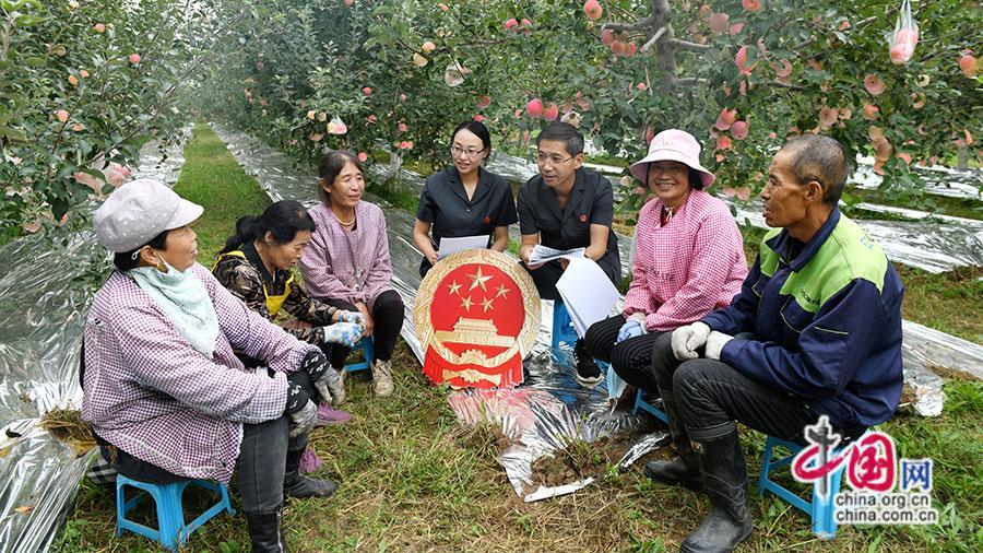 西峰區(qū)法院后官寨法庭法官在巡回審判后為果農(nóng)普法。中國(guó)網(wǎng)發(fā) 慶陽(yáng)市中級(jí)人民法院供圖