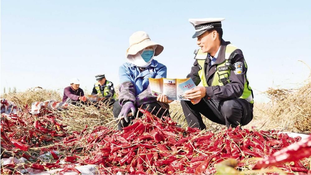 民警在田間地頭向群眾講解交通安全知識(shí)。近日,高臺(tái)縣公安局交通管理大隊(duì)駱駝城交警中隊(duì)民輔警通過(guò)發(fā)放宣傳資料、以案釋法、與村民面對(duì)面交流等方式,宣傳道路交通安全法律法規(guī),維護(hù)好豐收季節(jié)農(nóng)村道路交通秩序。新甘肅·甘肅法治報(bào)通訊員 蔣雯麗 攝