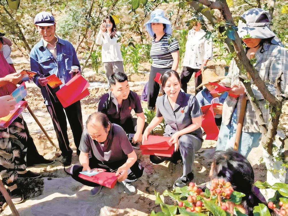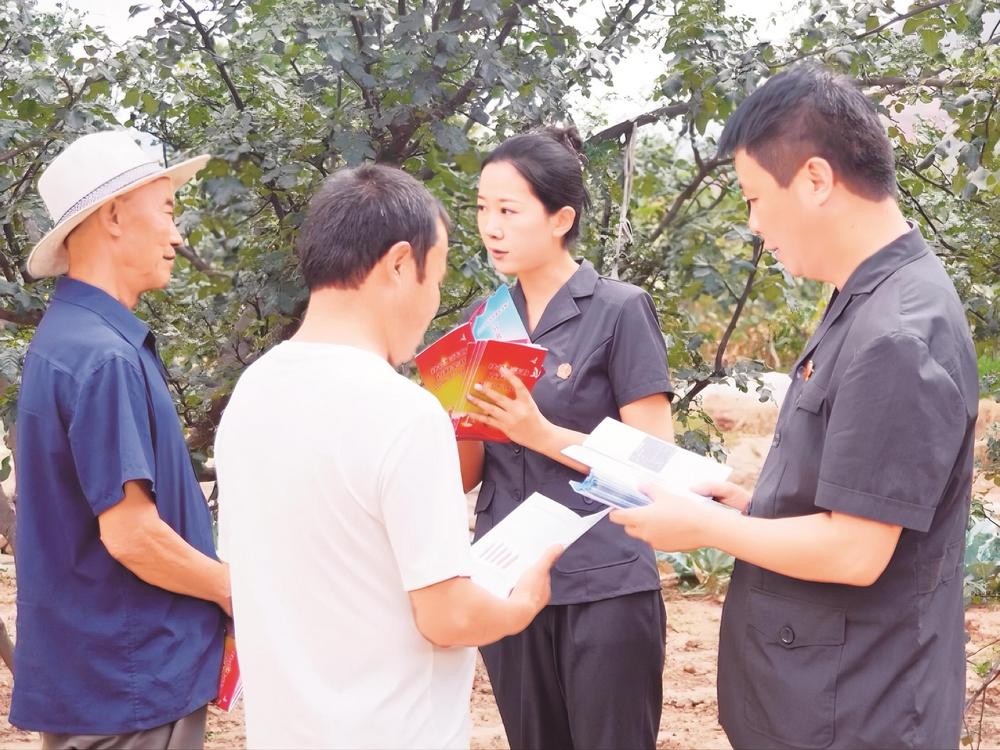 三河法庭干警深入田間地頭,向村民發(fā)放法律宣傳手冊。武都區(qū)法院供圖