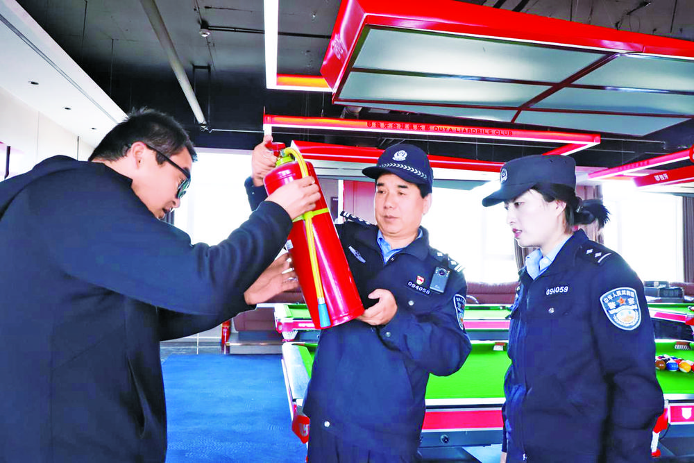 王進(jìn)保(右)在經(jīng)營場所檢查消防安全。