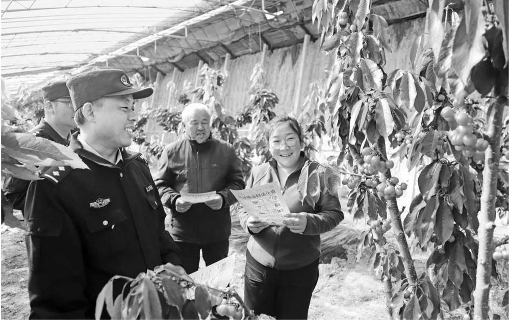3月10日,西峰公安分局顯勝派出所民警走進櫻桃大棚開展食品安全宣傳活動。新甘肅·甘肅法治報通訊員 左棟 攝