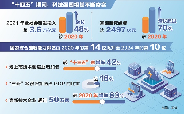 “這五年,科技創(chuàng)新能力穩(wěn)步提升,科技強(qiáng)國根基不斷夯實(shí)。”陰和俊說,我國科技投入持續(xù)增加,2024年全社會研發(fā)投入超3.6萬億元,較2020年增長48%;基礎(chǔ)研究經(jīng)費(fèi)達(dá)2497億元,較2020年增長超過70%,在量子科技、生命科學(xué)、物質(zhì)科學(xué)、空間科學(xué)等領(lǐng)域取得一批重大原創(chuàng)性成果;國家實(shí)驗(yàn)室體系建設(shè)穩(wěn)步推進(jìn),國家科研機(jī)構(gòu)、高水平研究型大學(xué)科研能力不斷提升,科技領(lǐng)軍企業(yè)加快培育成長;北京、上海、粵港澳大灣區(qū)國際科創(chuàng)中心支撐引領(lǐng)和輻射帶動(dòng)作用不斷增強(qiáng),深圳-香港-廣州躍居全球百強(qiáng)創(chuàng)新集群榜首;國家綜合創(chuàng)新能力排名由2020年的第14位提升至2024年的第10位。