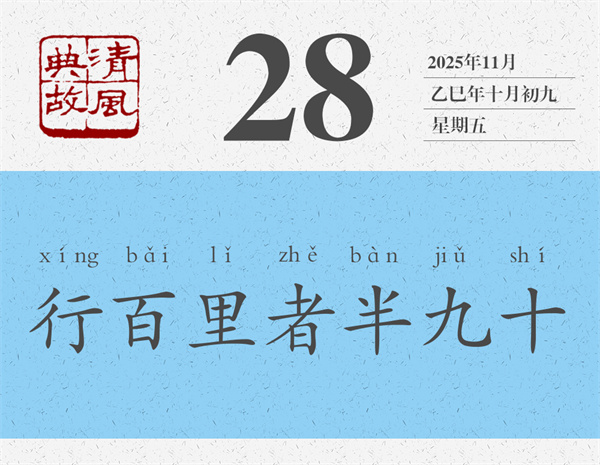 后人即以“行百里者半九十”為典,比喻做事情越到最后越困難,越接近成功越要認真對待。黃庭堅雜言詩《贈元發(fā)弟放言》:“虧功一簣,未成丘山。鑿井九階,不次水澤。行百里者半九十,小狐汔(qì)濟濡其尾。故曰時乎,時不再來。終終始始,是謂君子。”全詩幾乎都在闡釋“行百里者半九十”。其中還用了《周易》中的一個比喻:小狐貍過河時,幾乎就要過去了,但因為拼命掙扎,還是弄濕了尾巴。