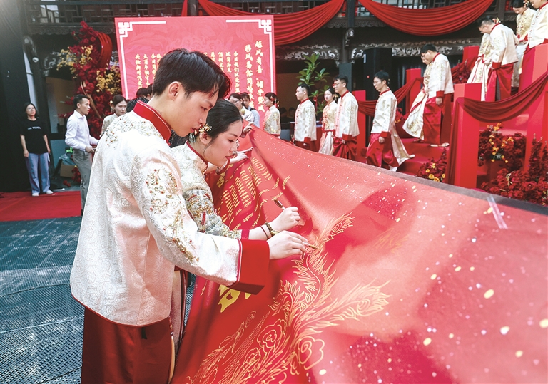 風成于上、俗化于下。近年來,越來越多新人選擇集體婚禮,倡導文明簡約的婚嫁理念,通過精心設計的集體婚禮儀式,打造既莊重又溫馨的婚禮體驗,既減輕經(jīng)濟負擔、又傳承美好家風,倡導婚俗改革文明新風尚。圖為在浙江省諸暨市西施故里景區(qū)內,參加集體婚禮儀式的新人們簽訂移風易俗簡婚承諾。新華社記者 徐昱 攝