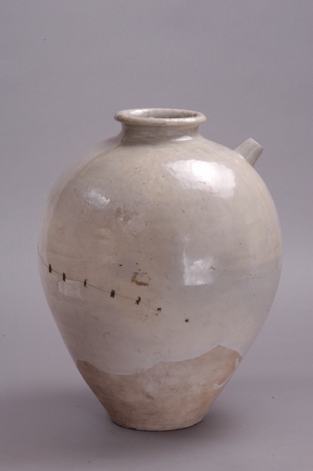 唐代,移交,初出土于武威弘化公主墓。高40.5厘米,口徑12厘米,底徑12.3厘米。圓唇,小口外卷沿,束頸,圓肩,下腹斜收,平底。肩部斜置一管狀短流。胎表有白色化妝土,通體施白釉,釉不及底,釉面光潤且有細碎冰裂紋。器身無花紋,造型規(guī)整、飽滿,具有鮮明的唐代風(fēng)格。