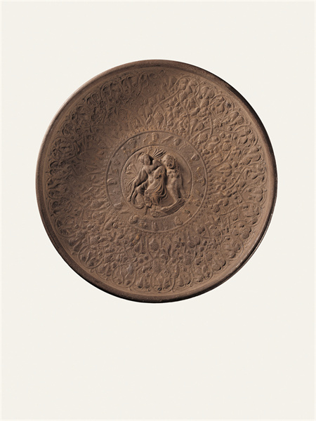 公元2-3世紀(jì),靖遠(yuǎn)縣征集,高4.6厘米,口徑31厘米,足徑10.9厘米。銀質(zhì)鎏金,以鑄造、錘鍱等工藝制成,鎏金已大部脫落。圓形,卷唇,斜孤壁,圈足。盤內(nèi)壁滿飾浮雕花紋,分3圈列置。外圈飾勾聯(lián)的葡萄卷草紋藤蔓,其間棲息30余只禽鳥等動物。中圈外緣飾細(xì)小聯(lián)珠紋,內(nèi)周環(huán)列12個頭像,頭像間為禽鳥等動物,或為希臘神話中的奧林匹斯山12神。中心為一高浮雕裸體男性,卷發(fā)無須,身披長巾,右手持圖爾索斯杖,杖首為松果狀飾物,為希臘神話中的酒神狄俄尼索斯。酒神倚一花豹而坐,鼻梁凸出,側(cè)首張口,頸下帶花環(huán),身上遍布圓斑。盤底圈足內(nèi)有一行刻作虛點的銘文,銘文年代晚于做器年代。此件器物發(fā)現(xiàn)于絲綢之路甘肅段的黃河渡口,是研究中西交流重要的實物資料,也是十分罕見的絲綢之路遺珍。