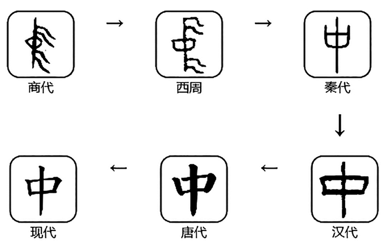 甲骨文“中”象旗幟之形,其上下部都有飄帶。直線的中間加上圈形指示符號,表示中央、中點等一般含義。秦系簡牘的“中”字省略了象征斿的部分,小篆和隸書字形中間的圈形又變?yōu)榉叫危蔀榱爽F(xiàn)在楷書的“中”。