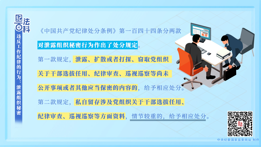 “嚴守黨的紀律,保守黨的秘密”,是每名黨員入黨宣誓時的鄭重承諾。無論選人用人工作、紀律審查工作,還是巡視巡察等工作,都有嚴格的保密紀律?!饵h政領(lǐng)導(dǎo)干部選拔任用工作條例》規(guī)定,選拔任用黨政領(lǐng)導(dǎo)干部,不準私自泄露研判、動議、民主推薦、民主測評、考察、醞釀、討論決定干部等有關(guān)情況?!吨袊伯a(chǎn)黨紀律檢查機關(guān)監(jiān)督執(zhí)紀工作規(guī)則》規(guī)定,監(jiān)督執(zhí)紀人員不準私自留存問題線索和涉案資料,嚴禁泄露審查調(diào)查工作情況,對紀檢干部私存線索、跑風(fēng)漏氣、違反安全保密規(guī)定等違紀行為要嚴肅處理?!吨袊伯a(chǎn)黨巡視工作條例》規(guī)定,巡視工作人員私自留存巡視工作資料,泄露與巡視工作有關(guān)的未公開信息的,要給予處理處分。
