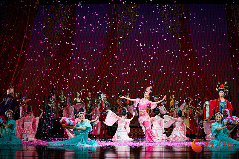 當(dāng)全息投影將莫高窟壁畫在舞臺(tái)上緩緩展開(kāi),當(dāng)駝鈴聲與電子樂(lè)編曲交織出跨越時(shí)空的和弦,觀眾相信,所謂“傳統(tǒng)”從不是凝固的標(biāo)本,而是流動(dòng)的生命,正如劇中穿越千年的花雨,落在古代畫工的筆端,落在當(dāng)代舞者的袖間,浸潤(rùn)海內(nèi)外每一位觀演者的心田。劇中描繪的中外友好通商、民心交融場(chǎng)景,更是對(duì)新時(shí)代“一帶一路”倡議的生動(dòng)詮釋。(甘肅省文化旅游廳供圖)