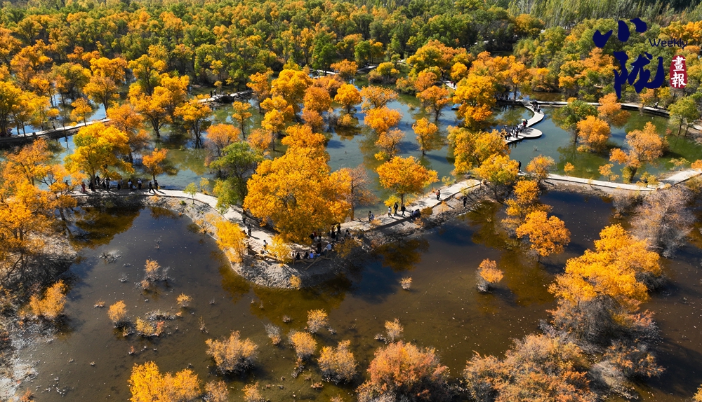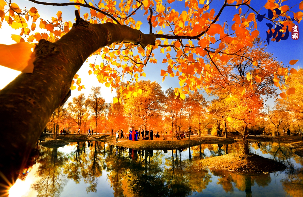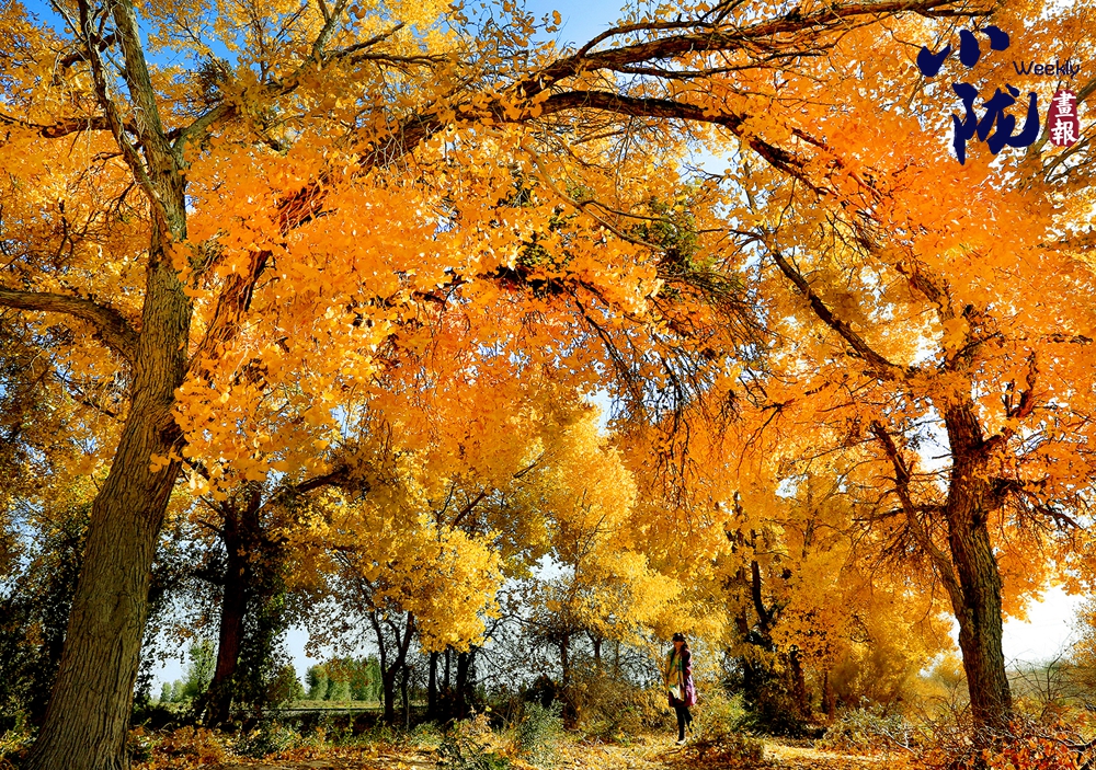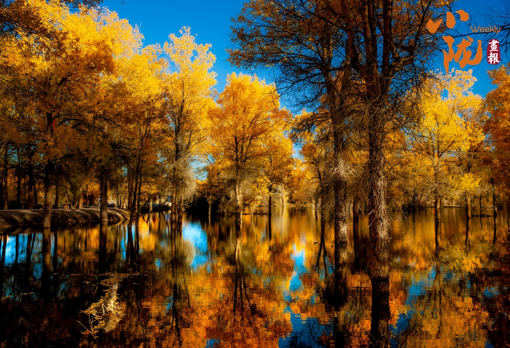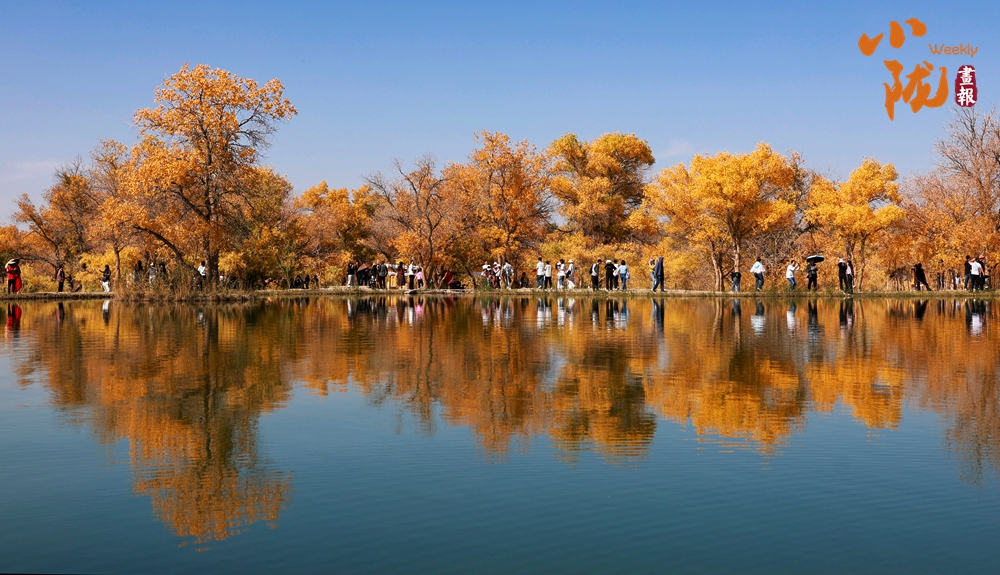 胡楊茂盛,疊翠流金,裊裊身姿倒影湖中。風(fēng)一吹,樹梢輕顫,成千上萬(wàn)片葉子像被點(diǎn)燃的火焰,在藍(lán)得沒(méi)有一絲雜質(zhì)的天空下翻涌、跳躍,充滿詩(shī)意。林間小道上,游客悠閑漫步,盡享美好時(shí)光。