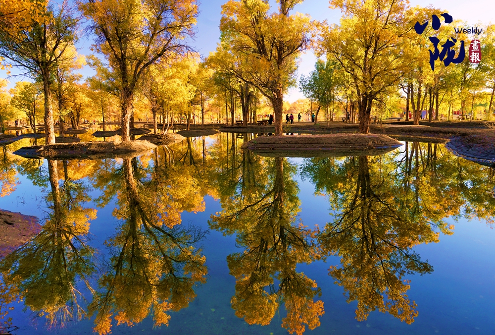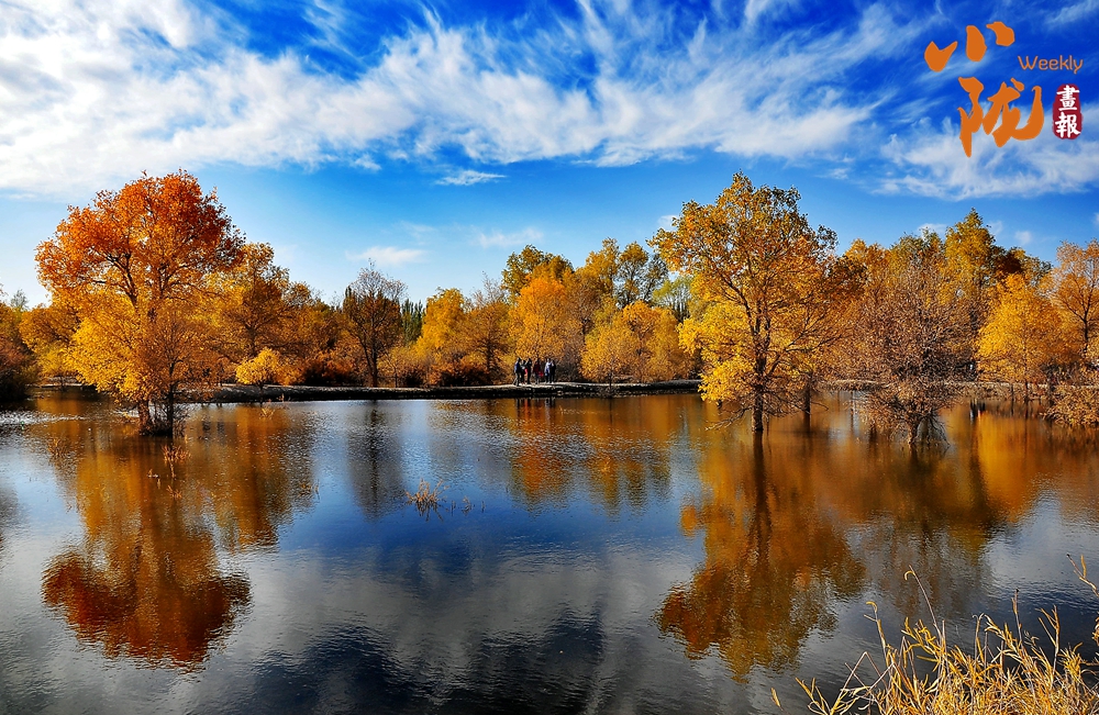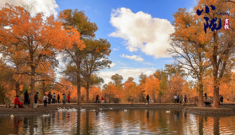 碧波蕩漾的金波湖倒映著胡楊,形成水中有林、林中有水的絕美畫面。游人如織,小橋流水,碧波蕩漾,白鵝嬉戲,若不是周邊金黃色的胡楊提醒,會(huì)讓人誤以為來(lái)到了江南水鄉(xiāng)。