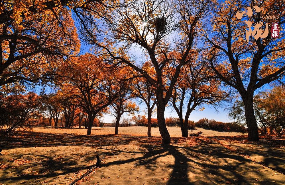 陽(yáng)光下,金色的樹葉映襯著湛藍(lán)的天空,在風(fēng)中婆娑起舞,把整個(gè)沙海點(diǎn)綴得生機(jī)勃勃。這個(gè)秋日,來(lái)金塔胡楊林,赴一場(chǎng)千年之約,享受“碧云天,黃葉地,秋色連波,波上寒煙翠”的視覺(jué)盛宴。