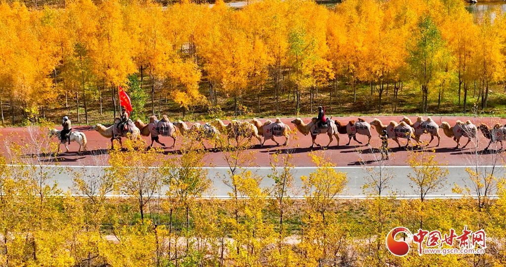 金秋十月,張掖市甘州區(qū)黑河林場(chǎng)萬(wàn)畝胡楊林迎來(lái)流金季節(jié)。10月15日,一支駝隊(duì)行進(jìn)其間,領(lǐng)略這最美的時(shí)光。這片昔日亂石林立、滿目瘡痍的黑河亂石灘,如今已成為6萬(wàn)畝的城市森林,游人、駝隊(duì)行進(jìn)其中,與金色林海共同構(gòu)成了一幅動(dòng)人的生態(tài)畫卷。