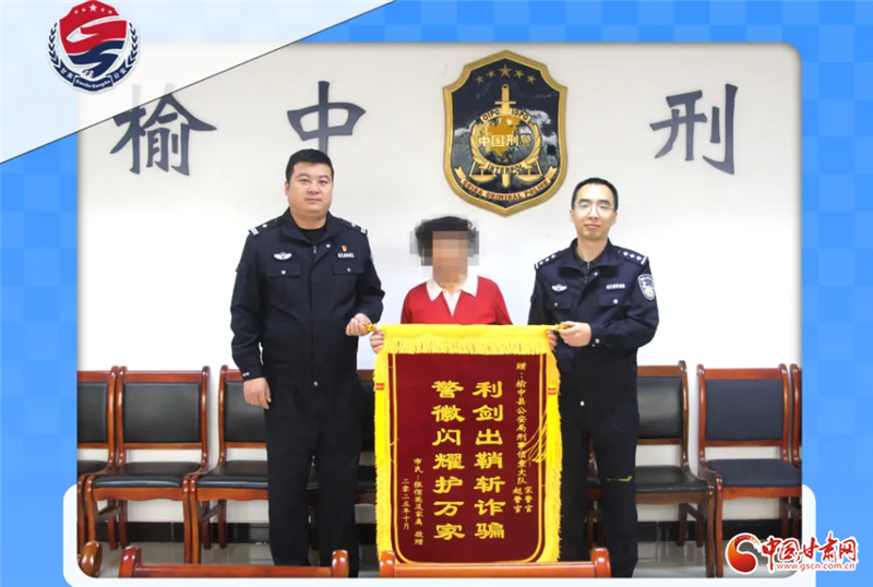 中國甘肅網(wǎng)11月3日訊(西北角·中國甘肅網(wǎng)記者 程?。┙眨m州市的張女士將一面印有“利劍出鞘斬詐騙 警徽閃耀護萬家”的錦旗,送到了榆中縣公安局刑警大隊辦案民警手中。