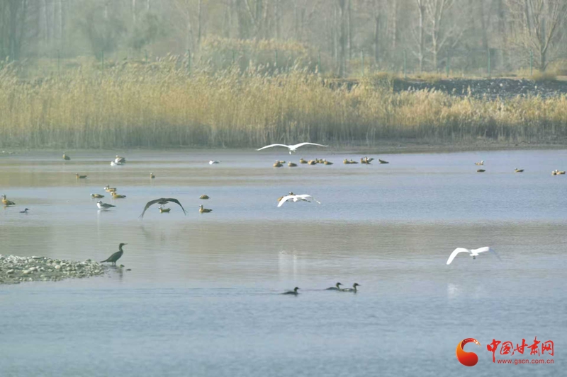 11月10日,初冬寒意漸濃,臨澤流沙河景區(qū)與雙泉湖水庫蘆葦叢間,響起遷徙鳥類的“集結(jié)號”。潔白的白鸛舒展雙翼、翩躚飛舞,成群麻鴨、鸕鶿緊隨而至,齊聚水域與葦蕩之間,為初冬景致添上靈動一筆,引得市民游客駐足抓拍。