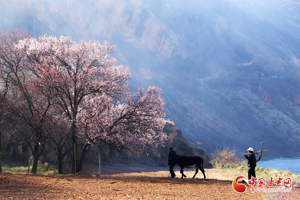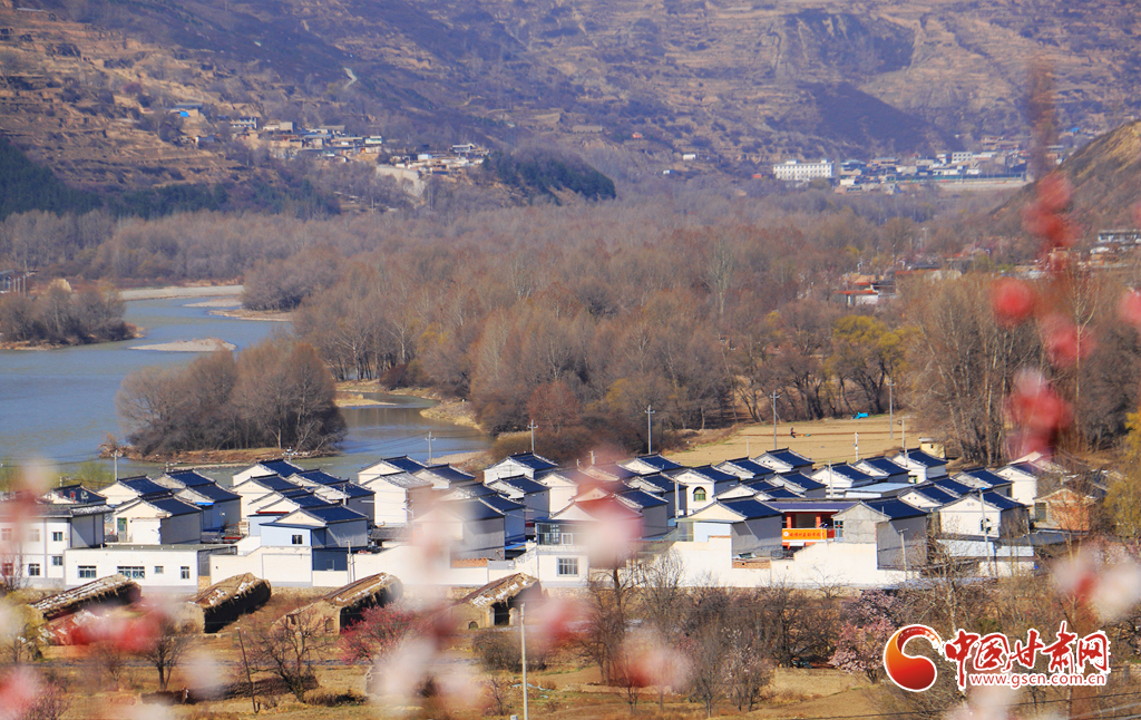 盛放的春花與錯落有致的民居、蜿蜒的洮水相映成趣