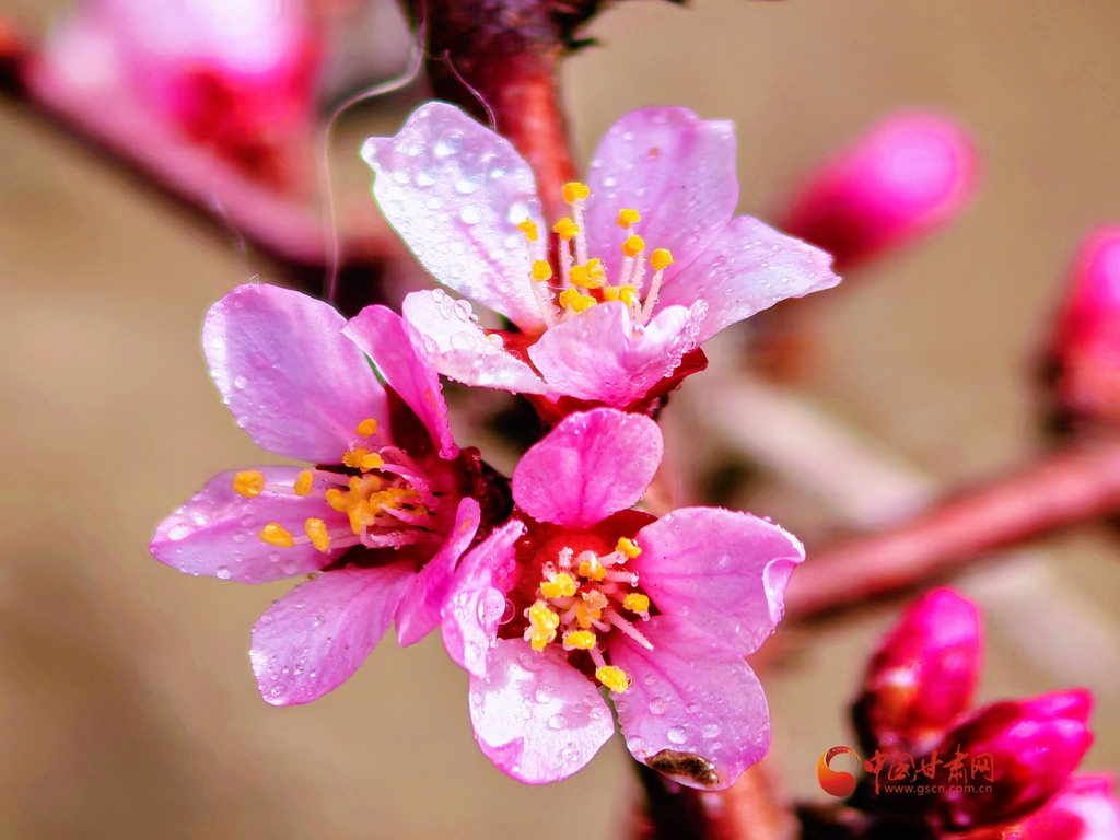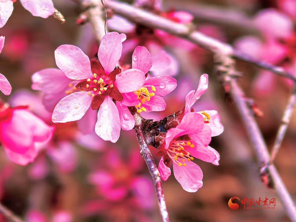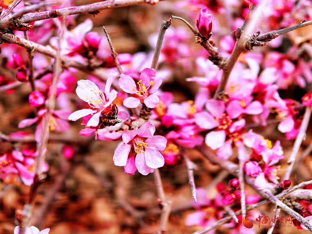光禿禿的枝條上,不見半片新葉,只有一簇簇、一團(tuán)團(tuán)粉紅色的小花,密密匝匝地綴滿枝頭,擠擠挨挨,溫暖又熱烈。遠(yuǎn)遠(yuǎn)望去,像一縷輕盈的粉紅色云煙,輕輕飄落在蒼黃的山坡上,為沉寂的祁連山添上一抹難得的溫柔亮色;走近細(xì)看,花瓣薄如蟬翼,質(zhì)地輕盈細(xì)膩,嫩黃的花蕊纖細(xì)挺立,在寒風(fēng)中微微顫動(dòng),看似柔弱的外表下,藏著不屈的傲骨。偶爾一場(chǎng)春雪突襲,潔白的雪花壓彎枝頭,花朵看似垂落不堪,可待到雪化風(fēng)輕,它便立刻挺直腰肢,重新舒展花瓣。夜里寒霜凍得花瓣晶瑩透明,仿佛一碰就碎,可朝陽(yáng)升起,寒冰慢慢消融,花朵依舊盛放如初,不曾輕易凋零半分。