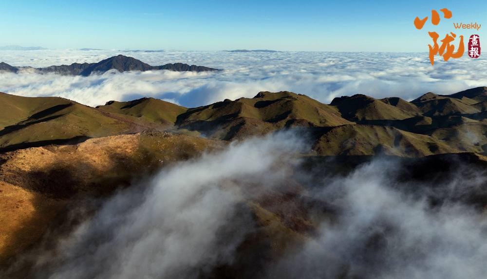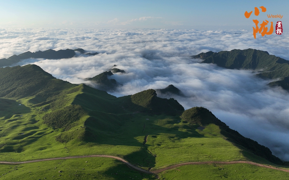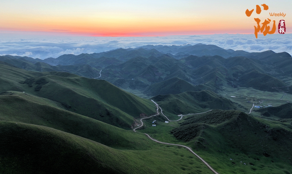 登頂望遠(yuǎn),千壩草原高山、草甸、草原相互交織,牛馬、羊群像一顆顆散落的珍珠點(diǎn)綴其中。茫茫云海鋪滿整個(gè)天際,翻涌的流云大河奔騰,蔚為壯觀,如臨于大海之濱。
