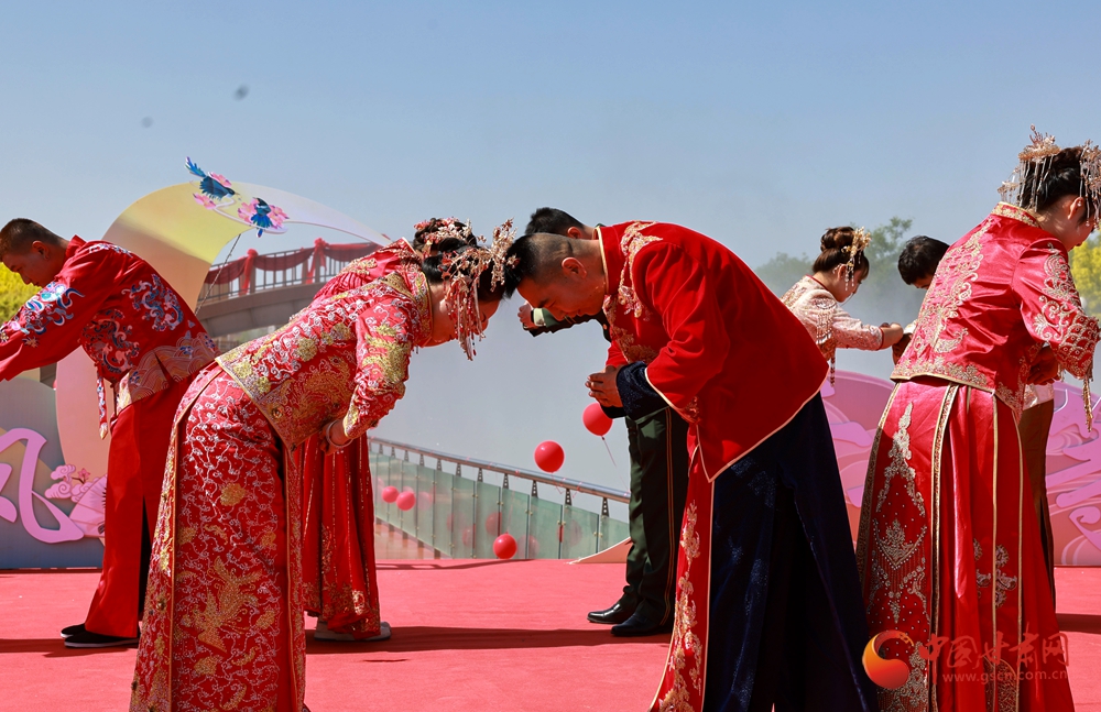 活動現(xiàn)場,古色古香的布置與悠揚婉轉的禮樂相得益彰。參加集體婚禮的新郎、新娘走過連心橋,共同牽繡球入場,舉行拜天地、行合巹禮等傳統(tǒng)儀式,一揖一禮間盡顯中式婚禮的莊重典雅與浪漫情懷,每一個環(huán)節(jié)都飽含著對新人的美好祝福。