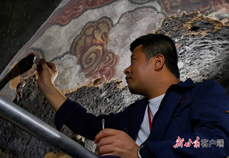 與窟外喧囂不同,在第30窟內(nèi),身著工裝的文物修復(fù)師緊握刀柄、輕刮泥土,讓壁畫(huà)和塑像重現(xiàn)昔日光彩。他們用巧手和匠心,靜靜地觸摸著“光陰的故事”。