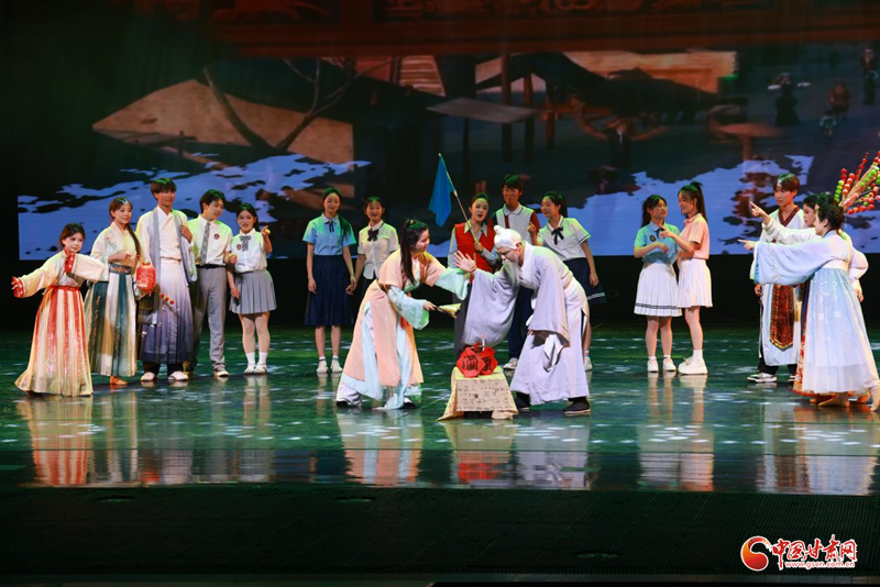 詩會以涼州詞為核心意象,主體分為“涼州·思”“涼州·行”“涼州·吟”“涼州·樂”四個篇章,各有側(cè)重又層層遞進(jìn),全方位展現(xiàn)涼州文化的多元魅力。第一篇章“涼州·思”以《天馬歌》的朗誦、《邊塞詩情》的情景劇與《鼓韻風(fēng)華》的表演,共同勾勒天馬傳奇與戍邊情懷,展現(xiàn)涼州深沉雄健的文化基因;第二篇章“涼州·行”借助AI主持與情景演繹,串聯(lián)起情景劇《跟著詩詞游武威》,以科技+文旅的視角,帶領(lǐng)觀眾開啟了一場沉浸式漫游;第三篇“涼州·吟”以《西涼樂舞》、音詩畫《涼州詞》等多元舞臺形式吟誦涼州詞章的雋永風(fēng)流,對誦表演《古涼新韻》,以“古今對話”解鎖涼州文化密碼,誦讀者交替誦讀“舊八景”與“新八景”組詩,從《大云晚鐘》《黃羊秋牧》等古景詩,到《河西都會》《摘星小鎮(zhèn)》等新景作,舞臺上“聲、形、畫、墨”交織,盡顯涼州古今風(fēng)貌,引得觀眾沉醉鼓掌;第四篇“涼州·樂”情景再現(xiàn)了《涼州夜宴》,品味葡萄美酒中的絲路情韻;尾聲“詩意涼州·藝游武威”,全場共同唱響對涼州的禮贊,并以“等你在涼州”發(fā)出誠摯邀約,讓千年涼州的詩意與魅力,在新時代持續(xù)綻放光彩。