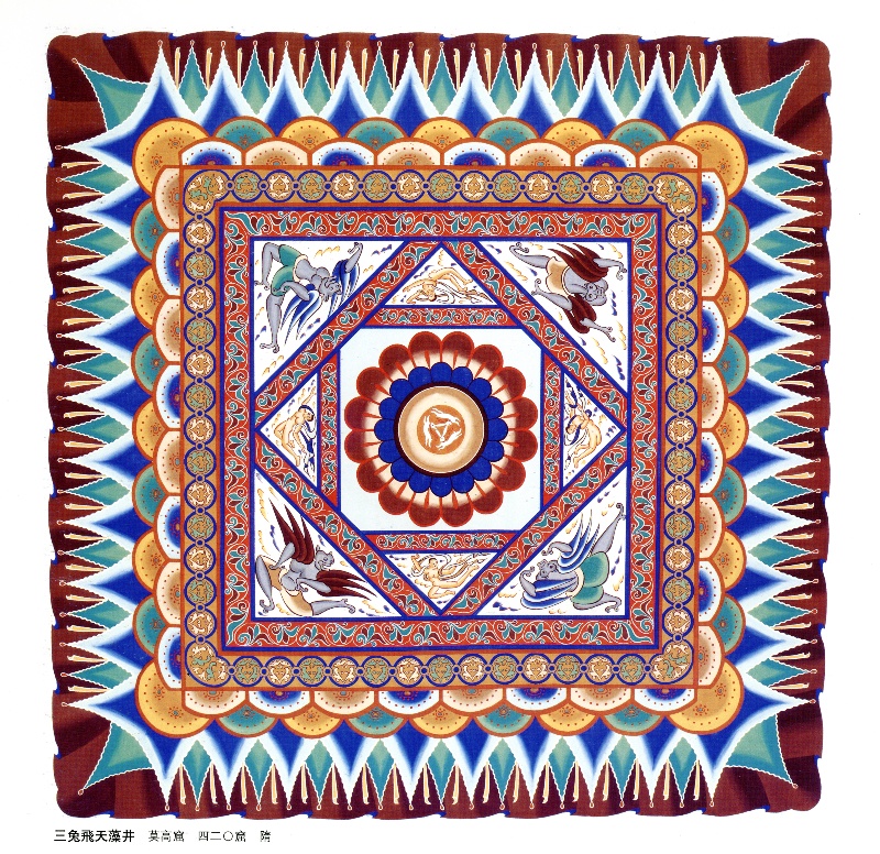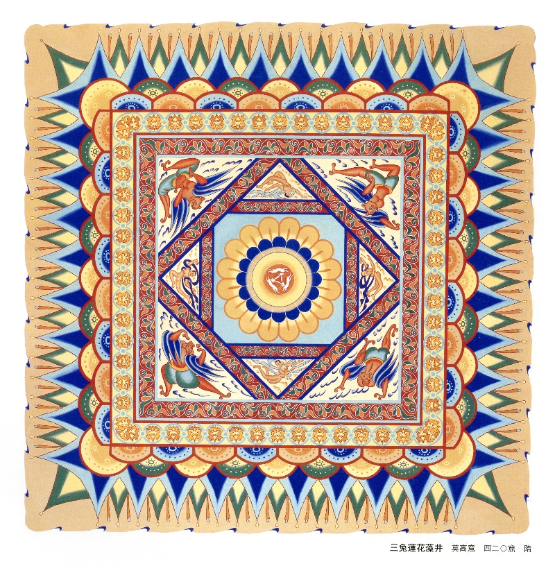 三兔共耳圖案、成熟的飛天造型、精美的紋飾圖案相互映襯,共同構(gòu)成了這幅令人嘆為觀止的藻井壁畫,受到人們的廣泛關(guān)注和喜愛(ài)。