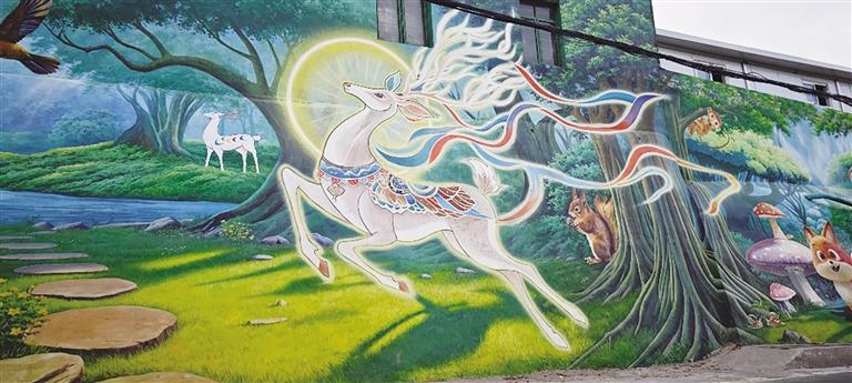 這些色彩斑斕的墻繪以城關(guān)區(qū)深厚的文化底蘊(yùn)為底色,將民俗風(fēng)情、自然生態(tài)與城市記憶巧妙交織。在伏龍坪街道,一面巨幅“舞獅”墻繪氣勢(shì)恢宏,紅黃相間的獅子昂首騰躍;在山間步道旁,“九色鹿”悠然立于云霧之間,靈動(dòng)雙眸映照山河,將敦煌文化的神秘與自然之美娓娓道來。