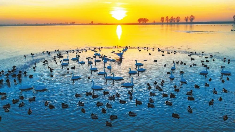 11月20日,甘肅金塔縣芨芨水庫(kù)濕地,遷徙越冬的白天鵝、赤麻鴨成群翔集湖面,成為初冬一道靚麗風(fēng)景。近年來(lái),金塔縣持續(xù)改善生態(tài)環(huán)境,加強(qiáng)濕地保護(hù)與修復(fù)工作,為水鳥提供了理想的棲息場(chǎng)所,每年在此棲息的候鳥多達(dá)數(shù)萬(wàn)只。 奔流新聞·蘭州晨報(bào)通訊員 曹紅祖 李鵬 段金龍 攝