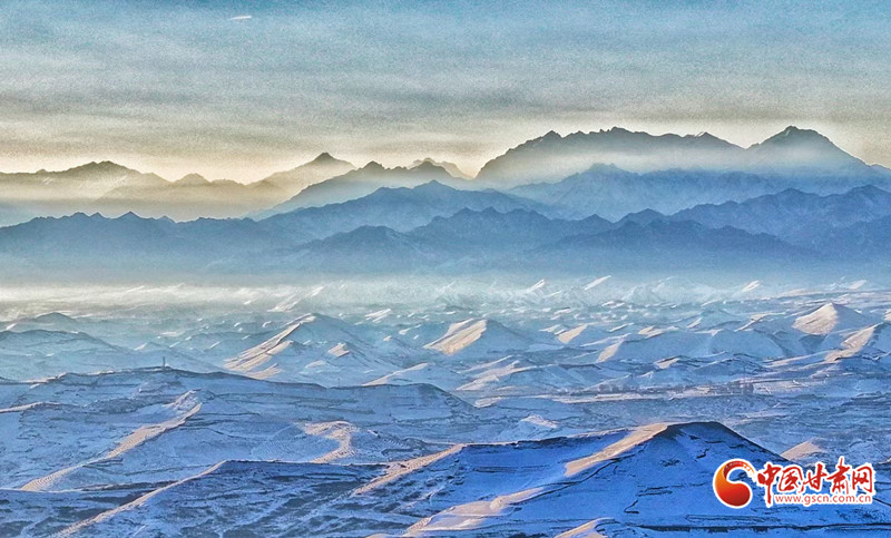 初冬時節(jié),位于張掖市民樂縣境內(nèi)的祁連山脈巍峨群鋒被一場大雪妝點的銀裝素裹,分外妖嬈,儼然一幅千里冰封萬里雪飄的北國風光圖。