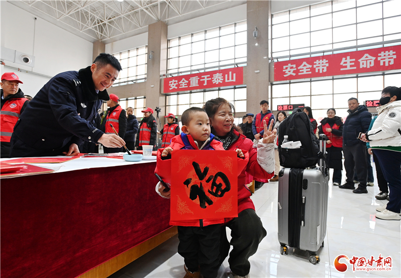 活動現(xiàn)場設(shè)置了“平安送福”“登車叮囑”等宣傳服務(wù)項目,現(xiàn)場為旅客、駕駛?cè)速浰痛郝?lián)、福字,提醒春運(yùn)文明安全出行。