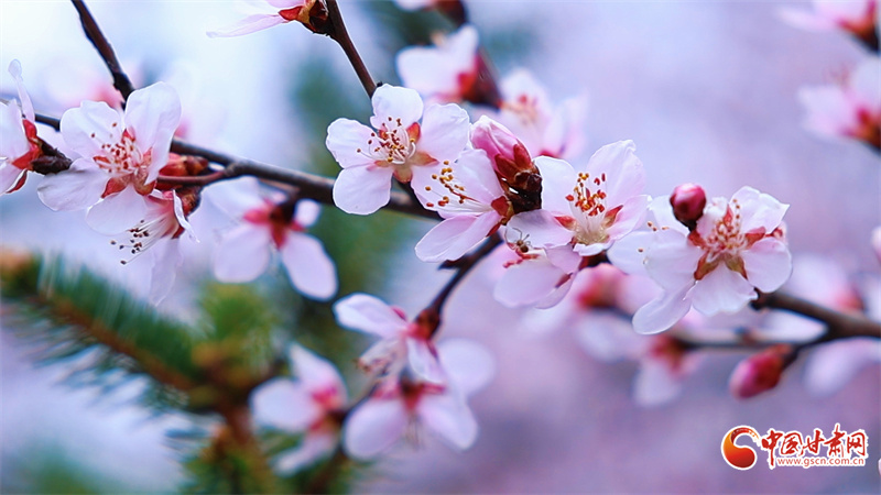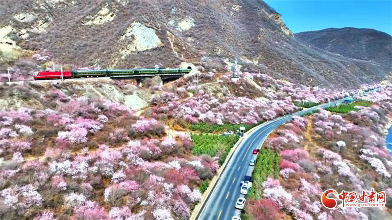 桃花朵朵開,如粉色綢帶纏繞在翠綠山間